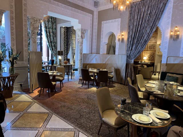 Under chef Hélène Darroze, the restaurant presents traditional dishes through a fine-dining lens, with tasting menus and refined versions of Moroccan classics served with the formal level of service associated with haute cuisine.