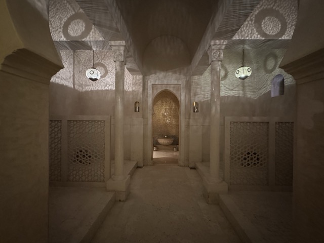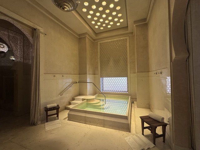 Facilities include the heated indoor pool, traditional hammams, a Watsu water-therapy area, ten treatment rooms and three private spa suites, along with beauty cabins and relaxation lounges.