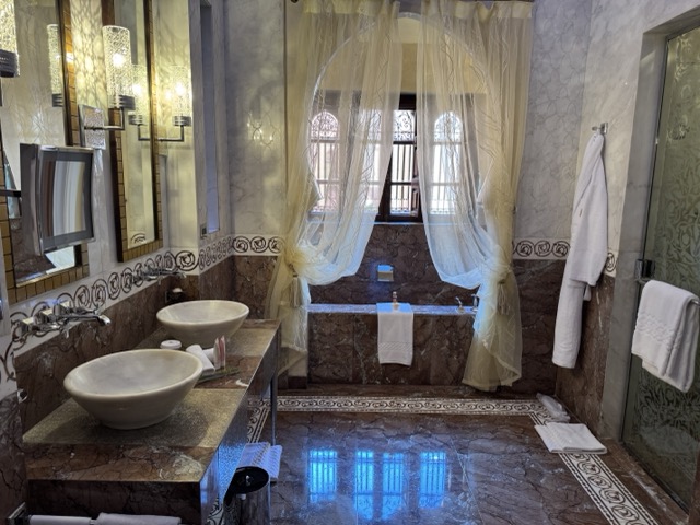 Bathrooms are finished in pale marble and onyx, with deep bathtubs, separate showers, double basins and mirrors framed in metal or carved plaster. The (plentiful supply of) towels were extremely luxurious – and huge!