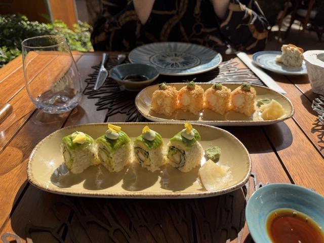 The menu combines Mediterranean dishes with grilled specialities, sushi, steamed dishes and wok preparations influenced by Japanese and Chinese cooking.